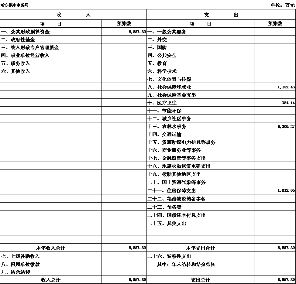 2013年纳入水务局部门预算管理的单位共26个,明细如下:365体育投注(机关)、哈尔滨市河道堤防管理处、哈尔滨市灌区管理处、哈尔滨市水务科学研究院、哈尔滨市水文水资源勘测总站、哈尔滨市西泉眼水库管理处、哈尔滨市滩涂开发管理办公室、哈尔滨市万家灌溉站、365体育投注成高子灌溉站、哈尔滨市水利工程质量监督站、哈尔滨市人民政府防汛抗旱指挥部办公室、哈尔滨市水利工程建设管理处、哈尔滨市水政监察局、哈尔滨市磨盘山水库管理处、哈尔滨市江北水城调度中心、哈尔滨市内河管理处、哈尔滨市水资源管理办公室、哈尔滨市水利征费办公室、哈尔滨市道里区防汛抗旱指挥部办公室、哈尔滨市南岗区防汛抗旱指挥部办公室、哈尔滨市道外区防汛抗旱指挥部办公室、哈尔滨市松北区防汛抗旱指挥部办公室、哈尔滨市香坊区防汛抗旱指挥部、哈尔滨市平房区人民政府防汛抗旱指挥部办公室、哈尔滨市江堤维修管理处、365体育投注船队。