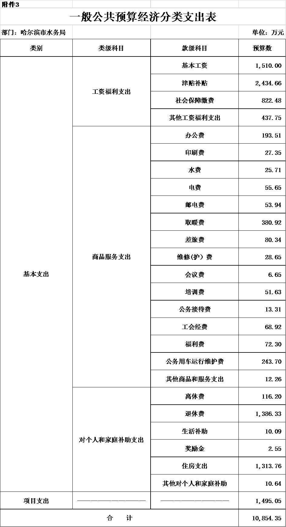 2015年哈尔滨水务局一般公共预算经济分类支出10,854.35万元,其中:工资福利支出5,204.89万元,占48%;商品服务支出1,314.84万元,占12%;对个人和家庭补助支出2,839.57万元,占26%;项目支出1,495.05万元,占14%。